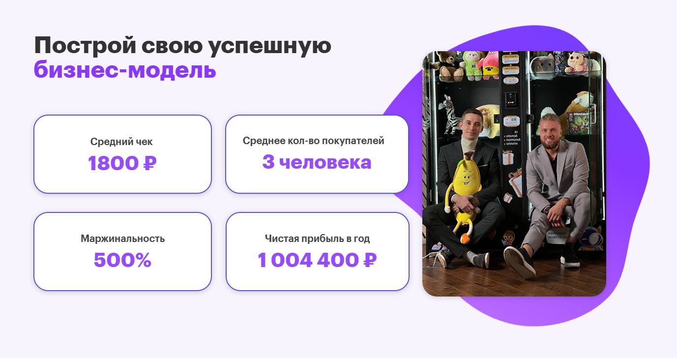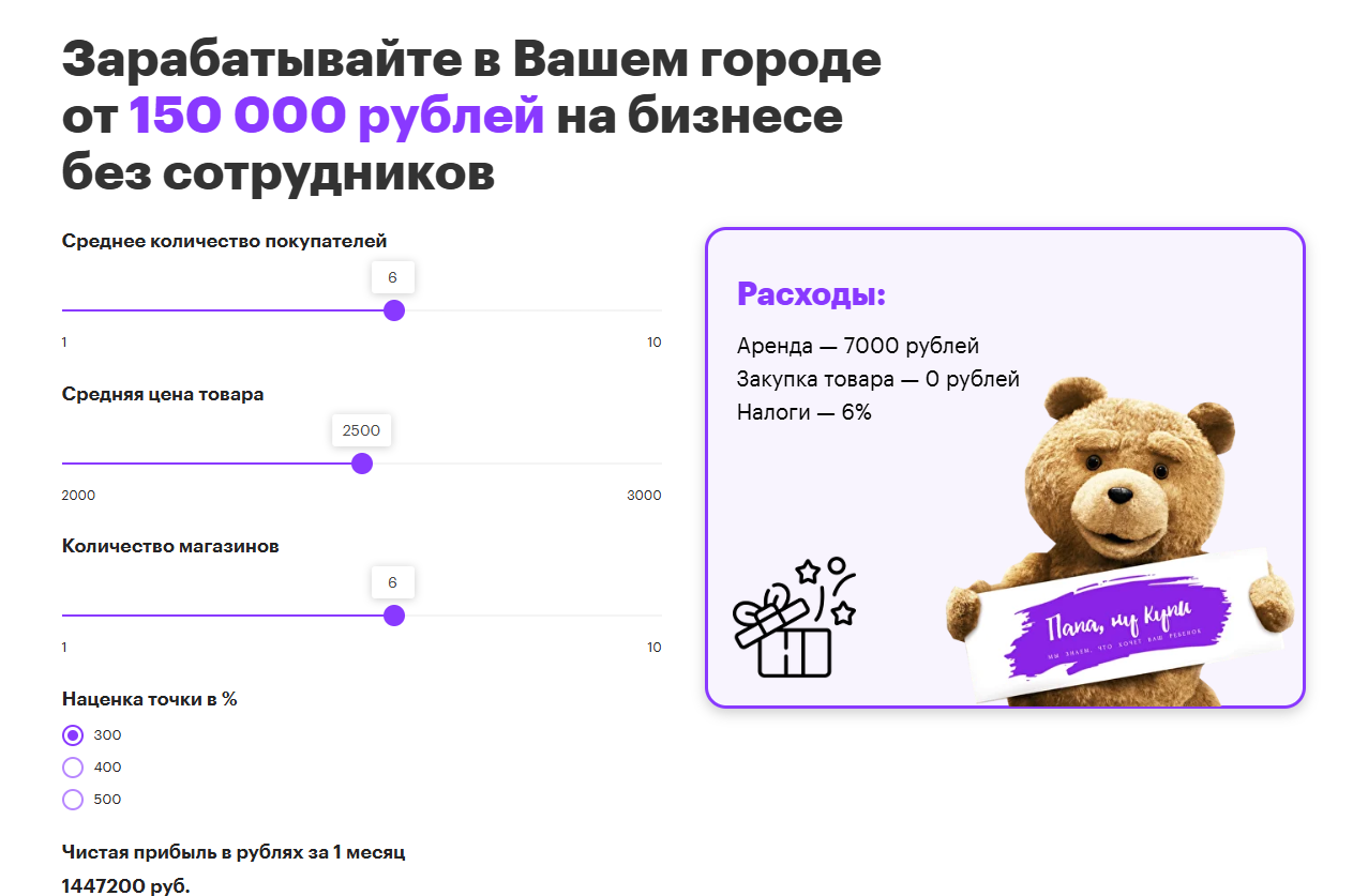 Клиентам обещают средний чек в ₽1,800, 3 клиента за сутки, маржинальность в 500% и чистую прибыль за год в размере ₽1,004,400. Команда франшизы по продаже игрушек «Папа, ну купи» никаких доказательств и гарантий не дает.