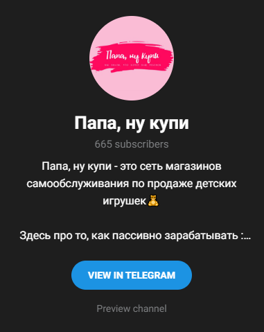 У франшизы «Папа, ну купи» на начало 2026 года есть телеграмм-канал на 665 пользователей. Подписчикам предлагают акции, рассказывают больше о работе сервиса.