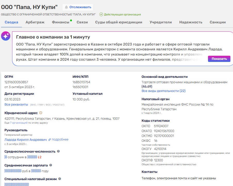 Инвестиционный проект официально принадлежит одноименному ООО «Папа, Ну Купи», созданному в октябре 2023 года.