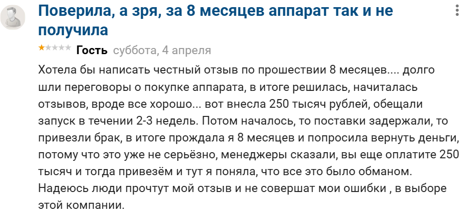 Мы нашли и реальный негативный отзыв от юзера о франшизе «Папа, ну купи». Он рассказал о срывах сроков, бракованном автомате по продаже игрушек, требовании внести дополнительные деньги для выхода из проекта.