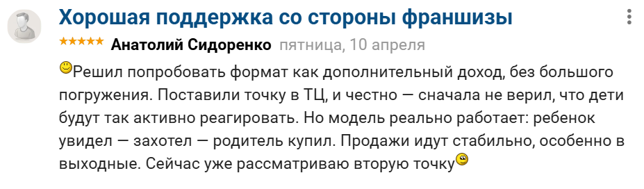 В открытых источниках нам удалось найти положительные отклики от франчайзи, которые поверили УТП Ладоды. Анатолий Сидоренко доволен стабильными продажами через точку в ТЦ, подумывает о покупке второго вендингового автомата.