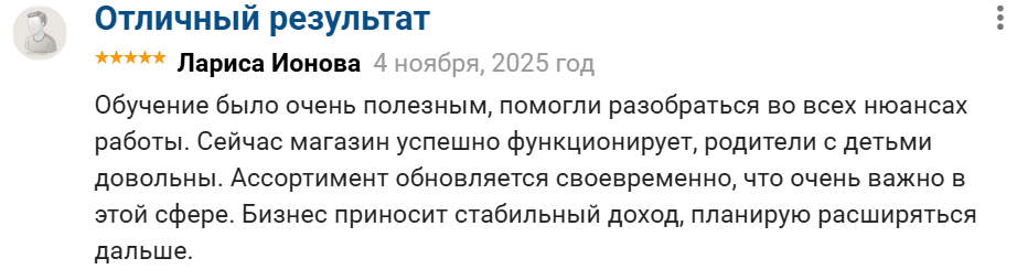 Клиент по имени Лариса Ионова довольна обучением в рамках франшизы, рассказала о стабильно работающем бизнесе с минимальным личным участием.