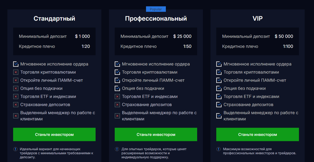 - «Профессиональный». Кредитное плечо 1:50, депозит 25 000 долларов, ПАММ-счет, сделки с криптой.
