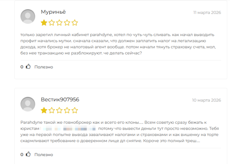 С момента своего выхода в интернет брокер с сомнительной репутацией не получил ни одного хорошего комментария. Нами не были найдены отзывы, в которых бы посредника Parahdyne благодарили за приятные тарифы, быстрые сделки, безопасность и скорость выплат прибыли.
