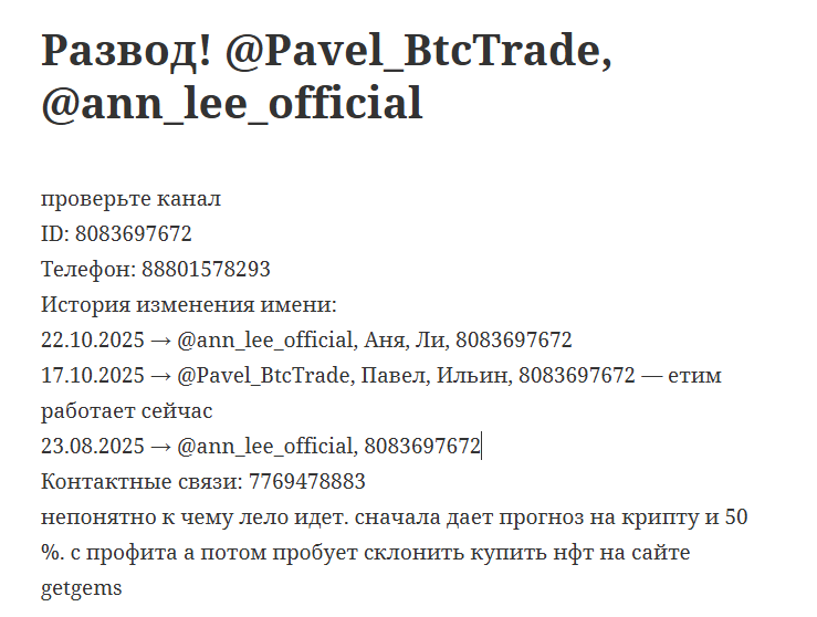 Кроме того, в отзывах есть жалобы на то, что в личной работе Павел начинает настойчиво предлагать купить НФТ на маркетплейсе Getgems. Однако и эта схема может быть сопряжена со скамом. Заметим, что осенью 2025 года в сети стали появляться сообщения о том, что анонимы под аккаунтами девушек начинают предлагать зарабатывать на кросс-чейн арбитраже, предлагая обменять USDT на XLM, а затем просто оставляют жертву ни с чем. Аккаунт Павла, судя по отзывам, также был женским и создан осенью 2025 года. Не исключено, что он связан с этими сомнительными схемами напрямую.