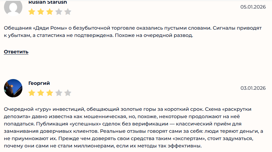 Негативные отзывы про “очередного гуру инвестиций” уже появились на различных ресурсах. Пользователи отмечают – раскрутка депозита является визитной карточкой мошенников, но порой все равно находятся доверчивые трейдеры. Ряд подписчиков утверждает, что Роман Павлов работает по скам схеме слива депозитов.