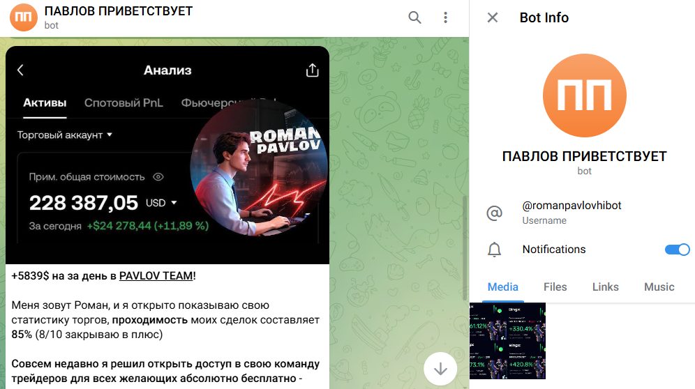 Romanpavl0v – ведущий Telegram-канала Pavlov ict trader. Автор представляется публике как Роман Павлов, однако верифицировать личность трейдера невозможно. Роман предлагает следовать его сигналам с высоким процентом проходимости, собирает рефералов, а также обещает конкретную финансовую прибыль участникам своего клуба. Далее в обзоре разберем, стоит ли верить словам основателя сообщества и какие риски есть для пользователей.