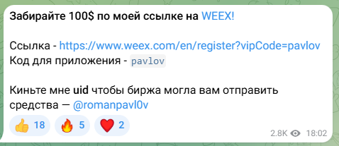 В описании Телеграмм канала Romanpavl0v обещает показывать открытую статистику торгов. На передний план в боте выходят скрины с щедрыми процентами прибыли, которые часто встречаются на каналах мошенников. Подобную “статистику” ничего не стоит подделать. Помимо рекламы биржи BingX, Роман также приглашает зарегистрироваться по его реферальной ссылке на Weex. Обе площадки имеют подгнившую репутацию – трейдеров блокируют без объяснения причин, присваивая их депозиты.