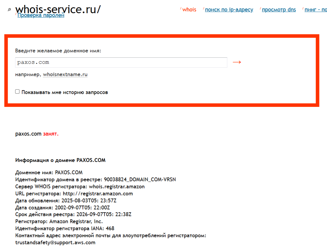 На сайте биржи Paxos отмечено, что работа площадки ведется давно. Наша проверка показала, что домен перешел к указанному сервису в 2025 году. Даже если активно работать на сайте указанной платформы, вывести заработанные средства все равно не получится, так как администрация биржи препятствует этому.