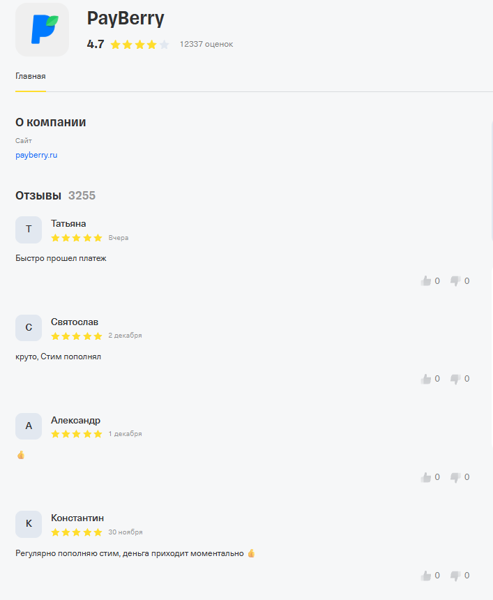 - В отзывах о « ПэйБэрри» нет яркого негатива, многие отмечают удобство площадки для пополнения «Стим», что выделяет сервис на фоне конкурентов.