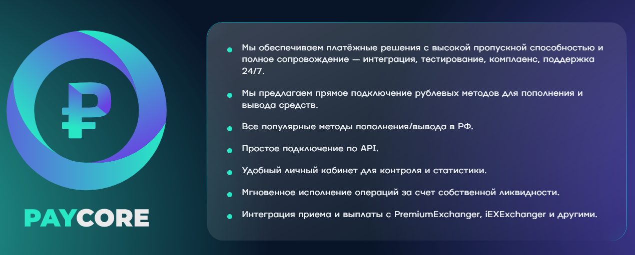 Платформа Paycore появилась в ноябре 2025 года. Ее создала анонимная команда, которая почти не дала информации о своем сервисе. Судя по сайту, их решения ориентированы на криптовалютные обменники, работающие с российскими клиентами.