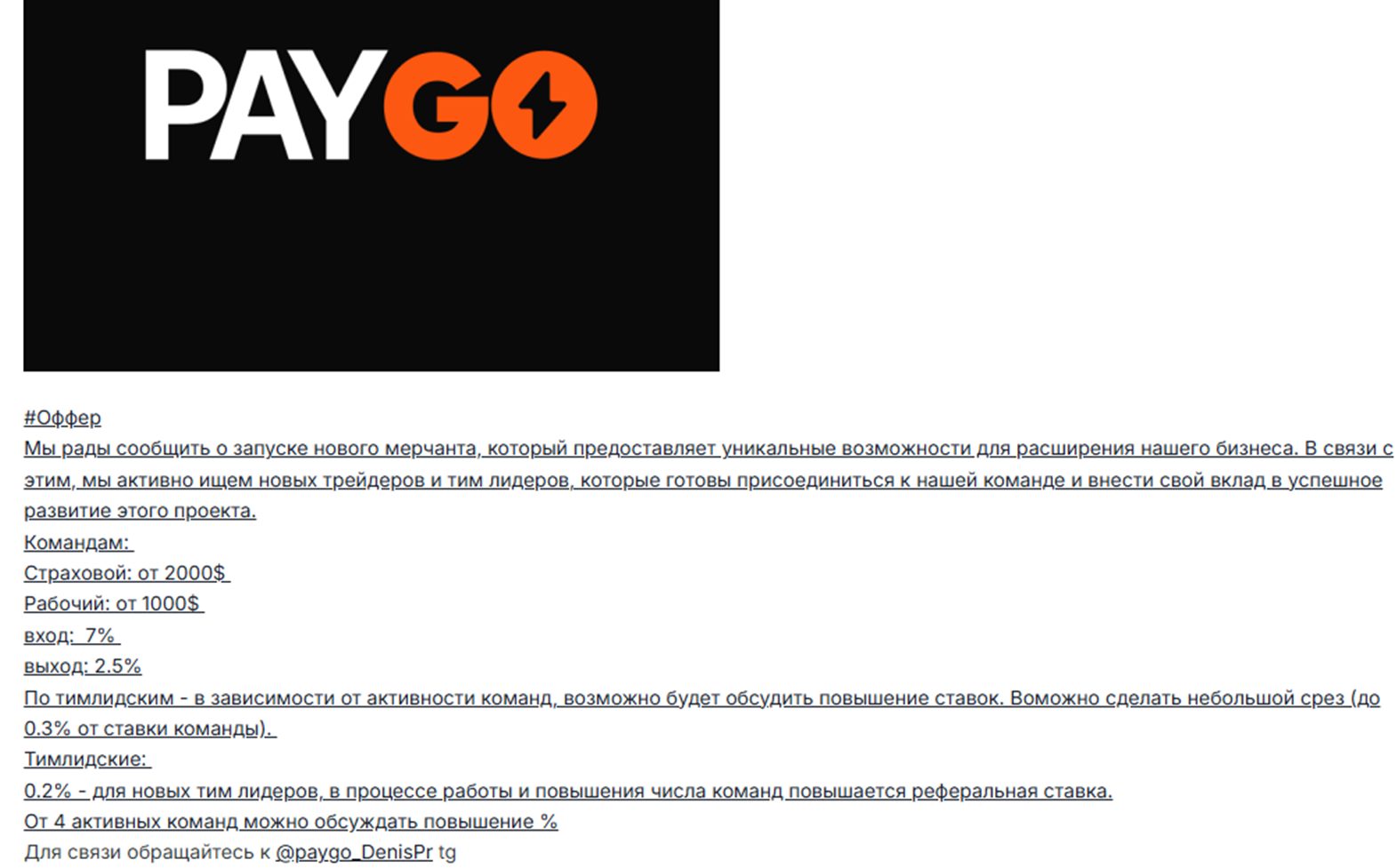 Из описания можно сделать вывод, что Paygo была запущена осенью 2025, но ссылок на официальный сайт нет. Хотя гордо заявлено, что площадка входит в ТОП-3 по популярности и удобству. Трейдерам обещан вторичный трафик и ставка до 9,5.