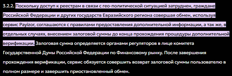 Пункт 3.2 прямо говорит о намерениях владельцев площадки. В связи с геополитическими событиями, доступ к каким-то резервам из Европы затруднен. Поэтому пользователи должны будут внести залоговую сумму до конца процедуры прохождения дополнительной верификации.