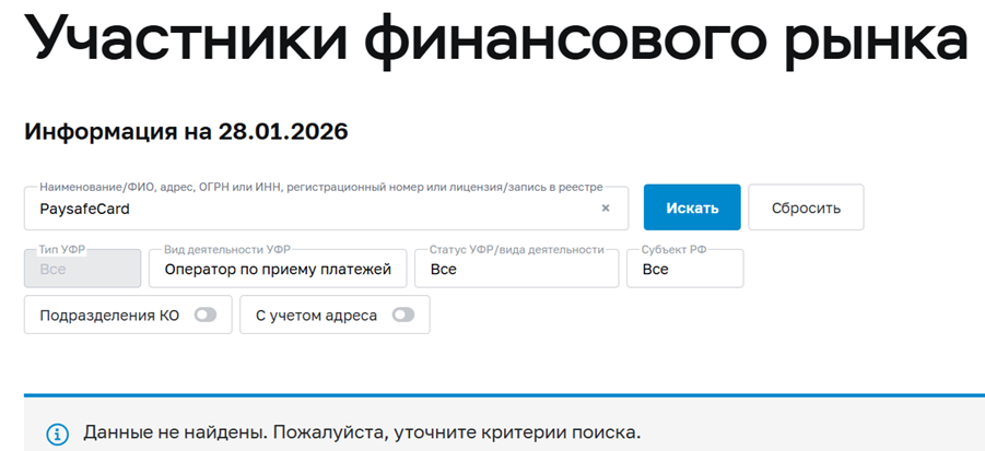 Чтобы точно ответить на вопрос, работает ли Paysafecard в России, необходимо проверить регуляцию. У этого сервиса нет официальной лицензии Центрального Банка, поэтому его деятельность в РФ незаконная. При финансовых спорах и других проблемах пользователи остаются без правовой защиты.