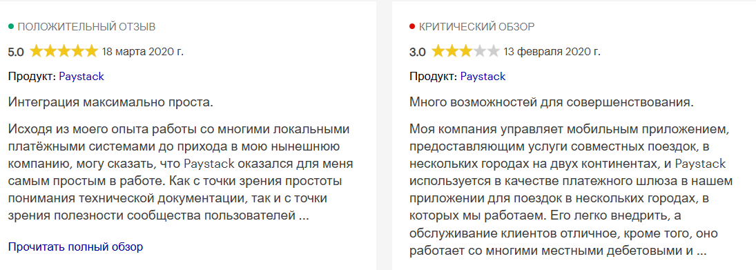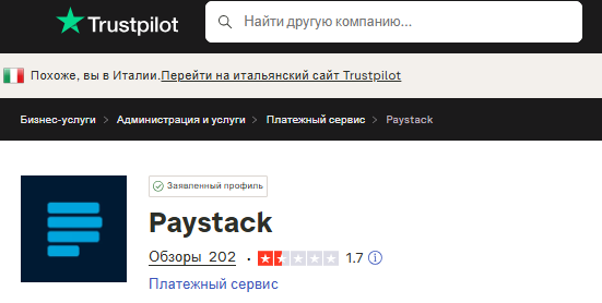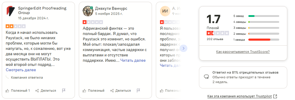 Так как эта компания не обслуживает бизнес в РФ, то отзывы мы нашли в основном на англоязычных площадках. И они отличаются радикально в своих оценках. Например, на Trustpilot сервис платежей Paystack получил оценку всего в 1,7 баллов из 5.