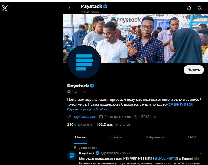 Официальное имя или ник компании в интернете и соцсетях – PaystackHQ. Две буквы в конце “HQ” означают “headquarters”, то есть “главный аккаунт Paystack”. Таким именем подписаны их страницы в X/Twitter, Instagram, LinkedIn, GitHub, Facebook.
