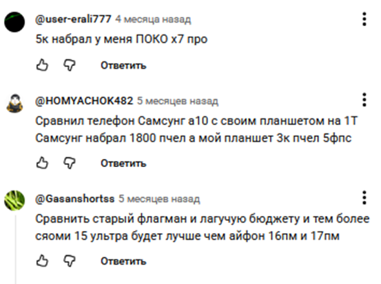 Количество отзывов о программе «Пчелы ФПС Тест» не самое большое. Удалось найти несколько обзоров приложения в Тик Ток и на Ютубе. Блогеры сравнивают производительность разных телефонов, показывают данные для операционных систем Андроид и iOS.