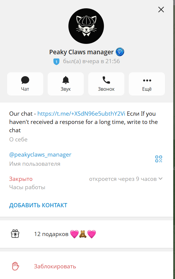 Peaky Claws не раскрывает контактных данных. Вся коммуникация с пользователями и поддержка осуществляются только через платформу. Включен основной бот Peaky claws bot, который служит точкой входа в игру, новостной канал peakyclaws news для объявлений и обновлений, а также закрытые чаты сообщества.
