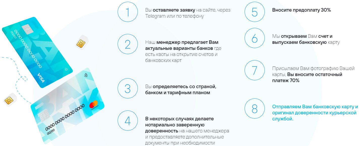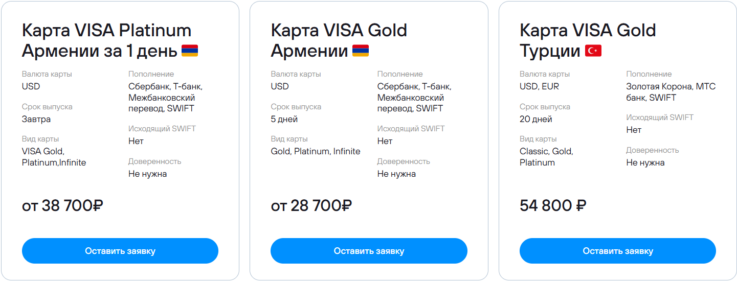 Клиентам предлагают большой выбор стран, из которых можно заказать карту. Для физических карт доступны 7 стран СНГ. Виртуальную дополнительно можно выпустить в Мексике. Цена стартует с 6900 рублей за мексиканскую виртуальную карту и достигает 54 800 за турецкую Visa Gold. Пополнять их можно с российских карт или в криптовалюте.