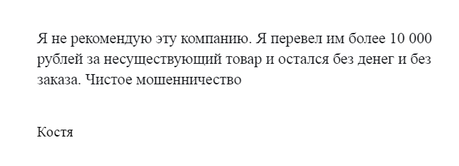 Другой клиент утверждает, что отдал больше ₽10,000 за продукцию фирмы, которой на самом деле не существует. Ни товара, ни возврата денег он так и не получил. Автор комментария не рекомендует связываться с этим магазином.