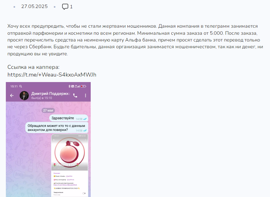Клиенты в отрицательных отзывах о Perfume And Co и профиле менеджера с ником @Parfmen заявляют, что основателями компании являются мошенники. Один из пользователей заказал товар и перечислил всю сумму на неименную карту Альфа банка. Купленной продукции он не дождался, а возвратить деньги не смог.