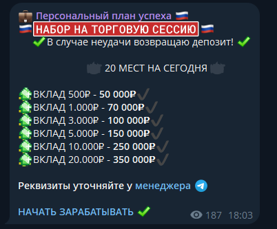 - админ рекламирует очевидный скам по раскрутке депозитов от 500 рублей до 50 тысяч;