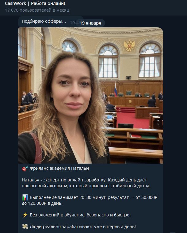 В одном из рекламируемых ботов, например, предлагают, очевидный скам – возможность получать якобы до 120 тысяч рублей в день.