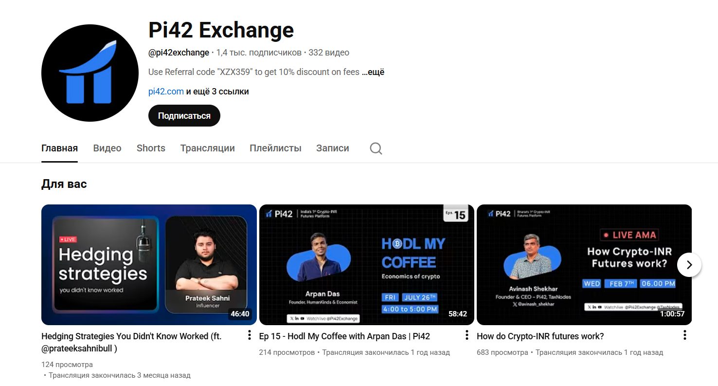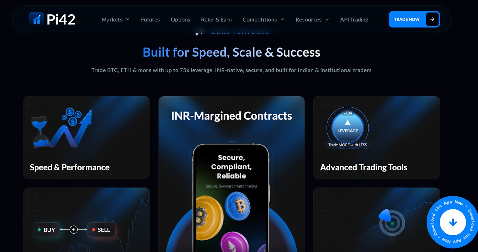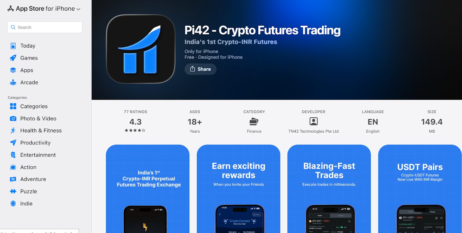 Сама платформа Pi42Exchange работает с 2023 г. и продвигается как решение для индийских трейдеров, уставших от налогового давления на спотовых биржах. Основной продукт это бессрочные фьючерсы и опционы с расчетом в INR и USDT.