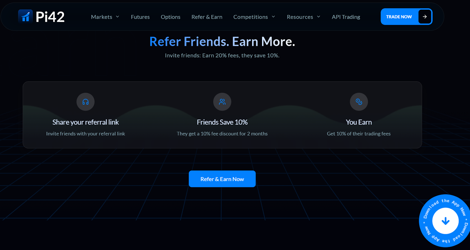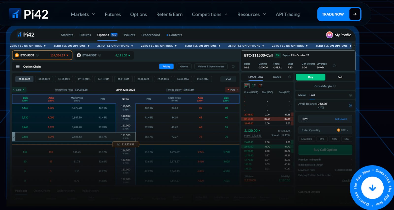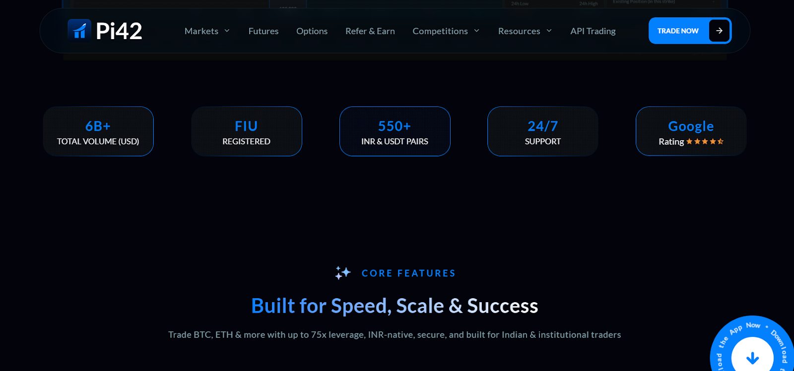 Сама платформа Pi42Exchange работает с 2023 г. и продвигается как решение для индийских трейдеров, уставших от налогового давления на спотовых биржах. Основной продукт это бессрочные фьючерсы и опционы с расчетом в INR и USDT.
