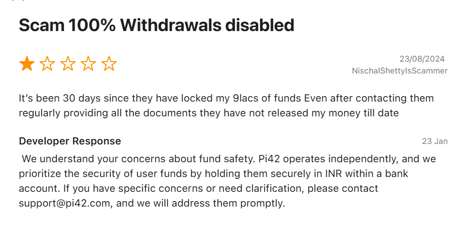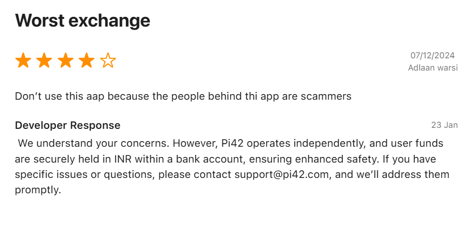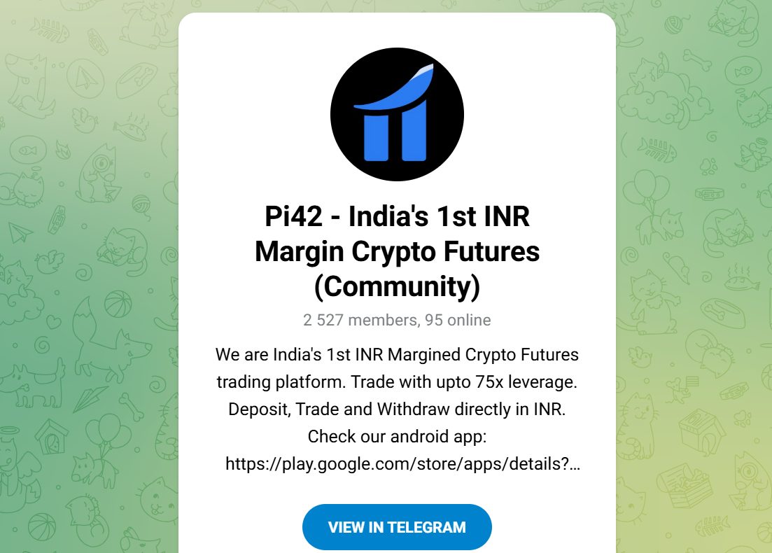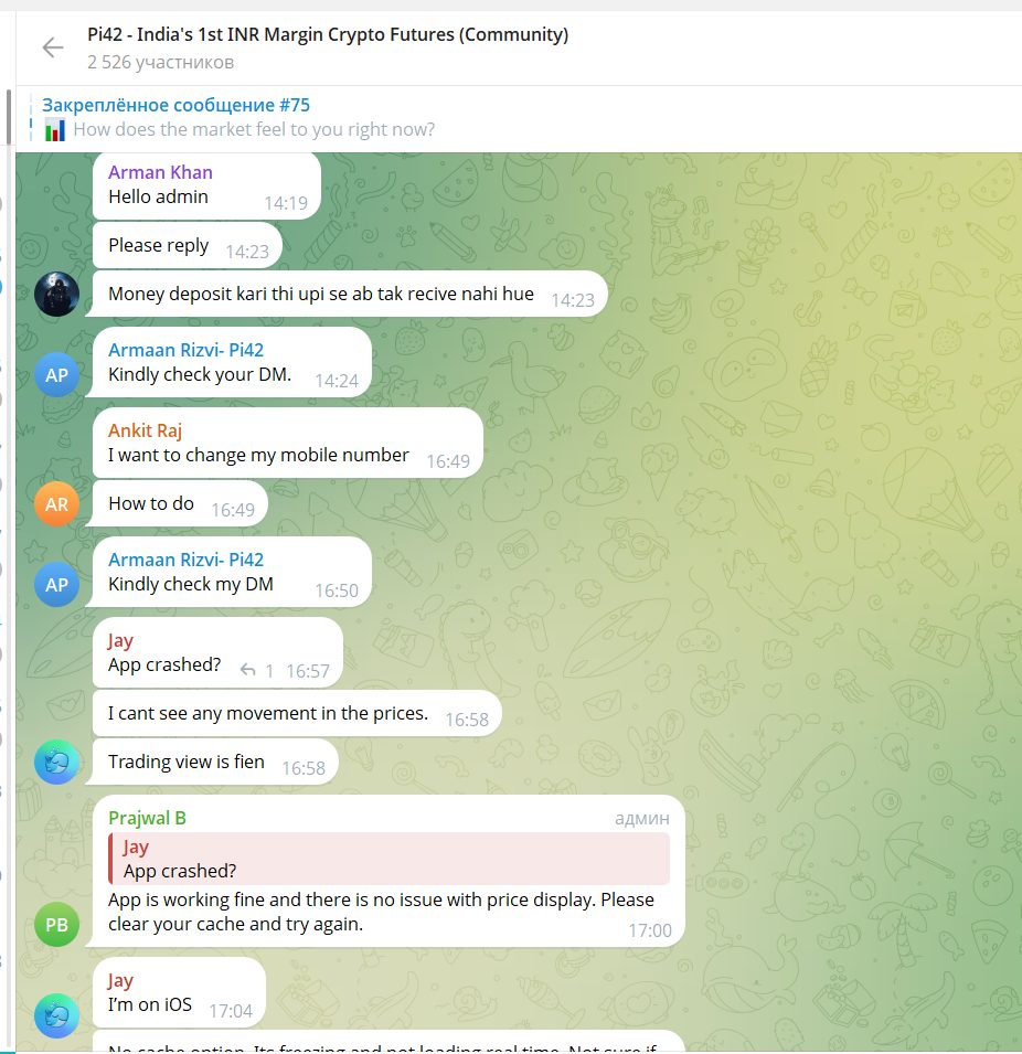 Есть тг сообщество “Pi42 India s 1st INR Margin Crypto Futures Community” с 2,5К участниками, где обсуждаются депозиты, работа приложения и технические сбои.