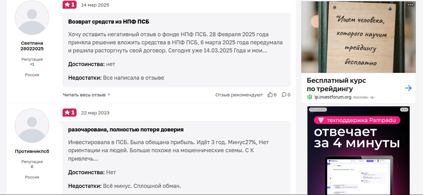 Бывшие инвесторы оставляют негативные отзывы о программе «Финансовая Подушка ПСБ». Вкладчики пишут, что управляющие фондом преднамеренно сливают деньги розничных инвесторов. Кроме того, клиенты сообщают про постоянное падение стоимости пая и несоответствие цифр на сайте «ПСБ» реальному обстоятельству дел.