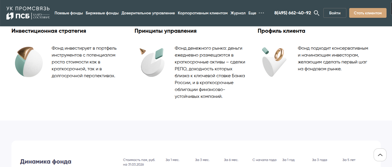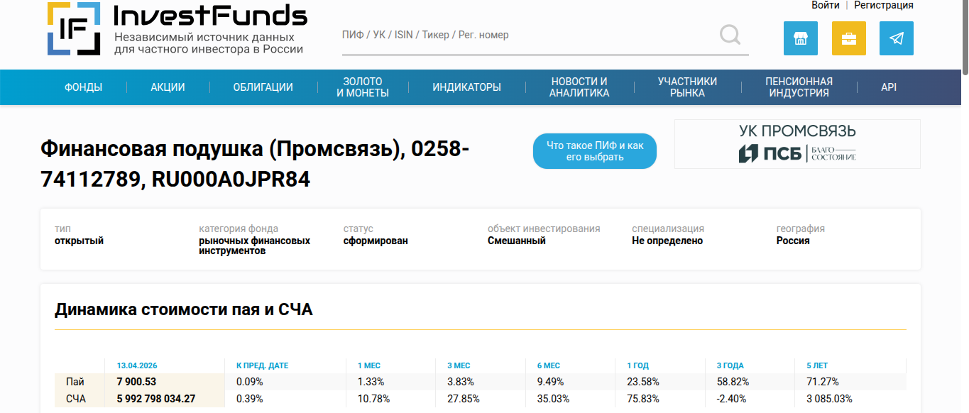 Эмитент предлагал рублевые вложения через Мосбиржу. На 13.04.2026 год стоимость пая составляет 7900 рублей. Также вкладывать деньги через «ПИФ Финансовая Подушка ПСБ» можно было только в российские финансовые инструменты.