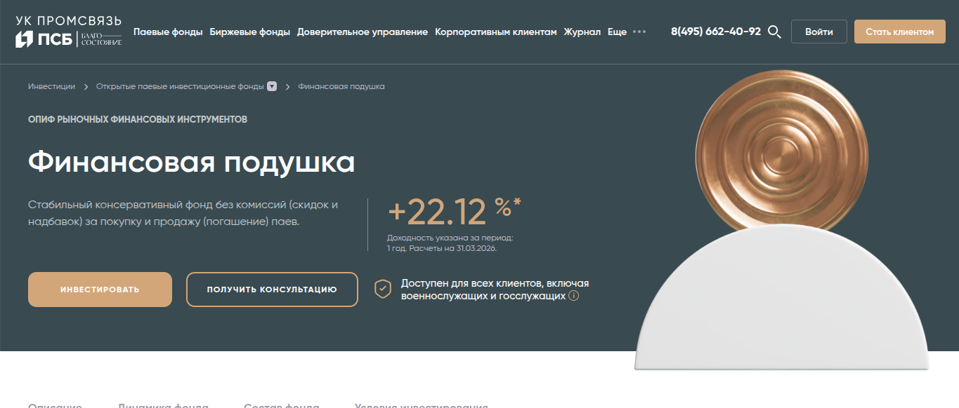 По разным данным программа «ПИФ Финансовая Подушка ПСБ» обещает 22.12% годовых по расчету на 31.03.2026 год. Стоит отметить, что долевое владение в ПИФ — крайне рискованный финансовый инструмент, потому что доходность может быть отрицательной. В итоге инвесторы могут потерять все свои вложения.
