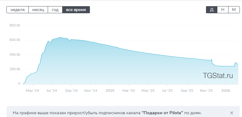 Анализ канала «Подарки от Pilota» (адрес pilotgift) показывает типичную картину проекта, ориентированного на массовый сбор аудитории через обещания легких денег. Ниже приведена актуальная статистика и технические показатели канала.