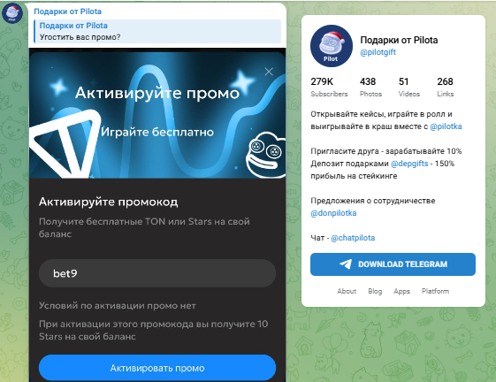 Бот «Пилот гифт» позиционируется как алгоритм с возможностью выдавать небольшие вознаграждения за выполнение заданий, подписки и участие в акциях. О проекте Pilot gift в его телеграм-канале много рекламы. Есть у тгк «Подарки от Pilota» объявления о раздачах, приглашениях и промо‑акциях. Иногда встречаются посты с подтверждениями выплат.