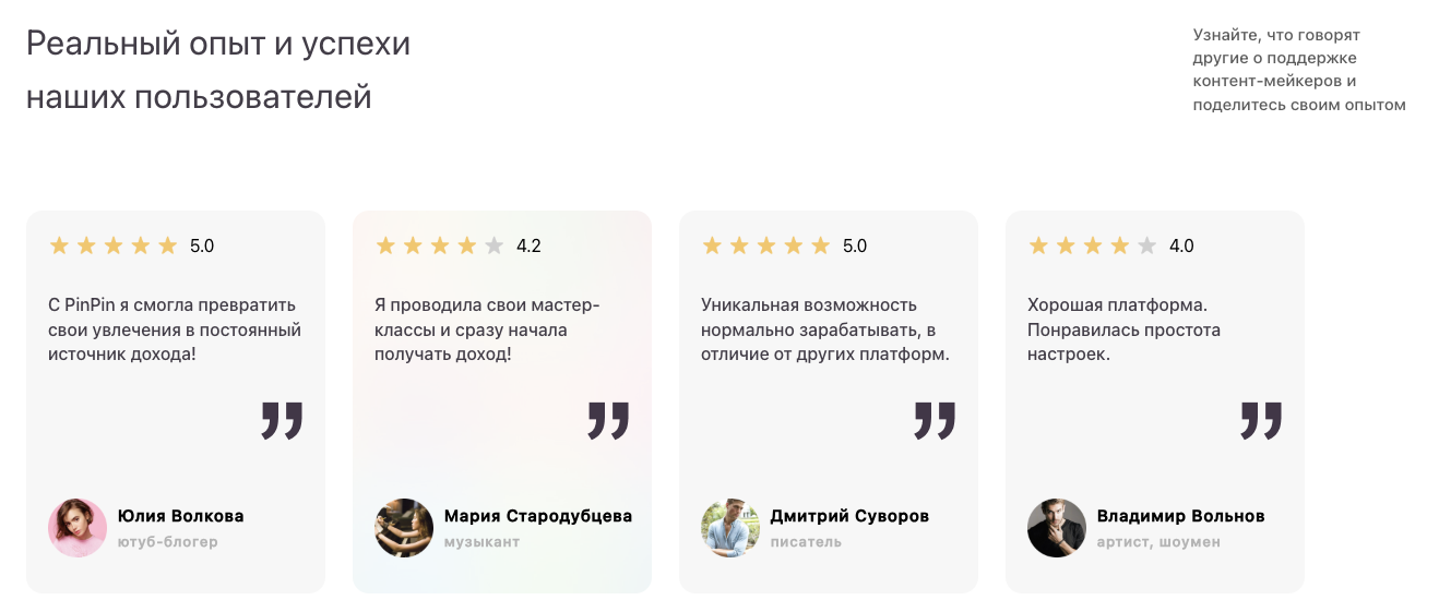 Отзывы о заработке на платформе Pin Pin присутствуют на ее официальном сайте, который находится по адресу pinpin one. Весь этот фидбэк положительный, но никакого доверия он не вызывает. Проблема в том, что авторов этих отзывов о сервисе «ПинПин» невозможно верифицировать.