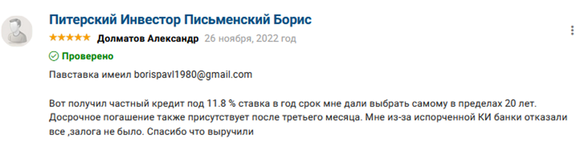 Письменский Борис Павлович – отзывы клиентов о работе с частным инвестором, проверка безопасности частных займов с Pismenskij Boris