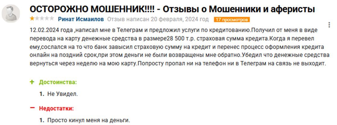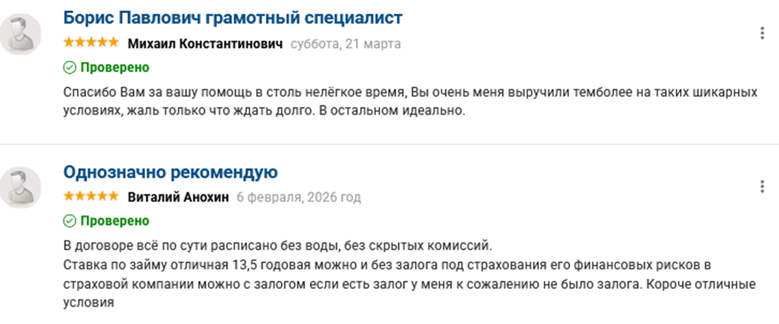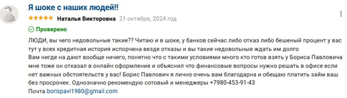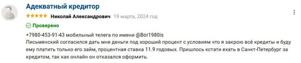 Если он реально помогает, как частный кредитор, хорошо. Отрицательные отзывы — бред какой-то. Одна приехать отказалась, другой — вообще ходячий косяк. Но все отзывы 2025 года. То есть только начал выдавать займы. И мне бы интересно было бы услышать комментарии тех, кто расплатился. Так ли всё гладко. А пока только наблюдаем.