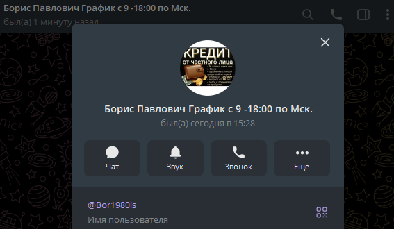 Брокер Письменский Борис Павлович не имеет собственного сайта или групп в социальных сетях. Взаимодействие с потенциальными клиентами происходит по телефону +79804539143 или через Телеграмм. В ТГ открыт аккаунт «Борис Павлович График с 9 — 18:00 по Мск» (Bor1980is), на которых предлагается писать по вопросам оценки и получения займа.