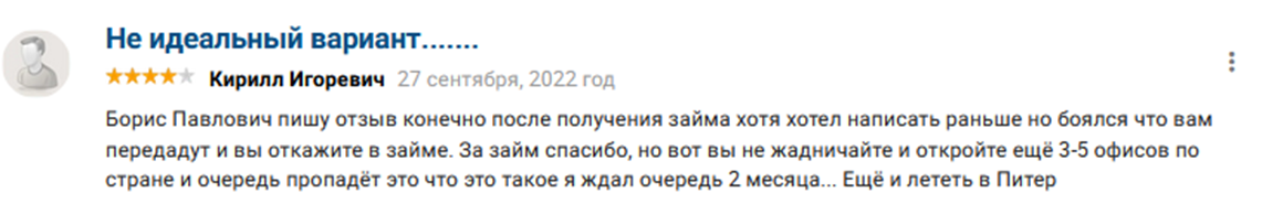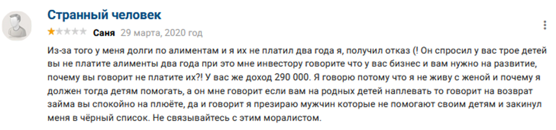 На независимых мониторингах есть достаточное количество негативных отзывов о Письменском. Большая часть жалоб касается отказов из-за уже имеющихся задолженностей. Также некоторые несостоявшиеся заемщики говорят, что инвестор не соглашается оформлять договор онлайн, при этом ведет себя по-хамски.