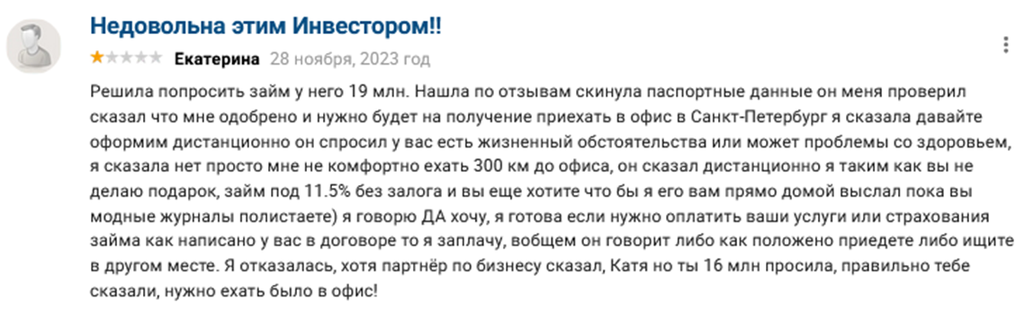 Найдены и откровенные обвинения в том, что инвестор Письменский Борис Павлович – мошенник. По слова пострадавшего клиента, у него потребовали сначала оплатить страховку, сославшись на условия банка. После перевода кредитор просто перестал выходить на связь. Клиент не получил займ, страховка ему возвращена не была.