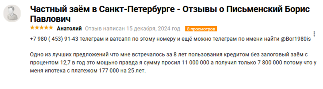 Является ли Письменский Борис Павлович мошенником? Прямо ответить на этот вопрос сложно, так как о предпринимателе ничего не известно. Из отзывов непонятно, выдает ли он в качестве займа собственные средства или является посредником. Информации о регистрации нет, также отсутствуют данные о том, работает ли кредитор в какой-либо финансовой компании.