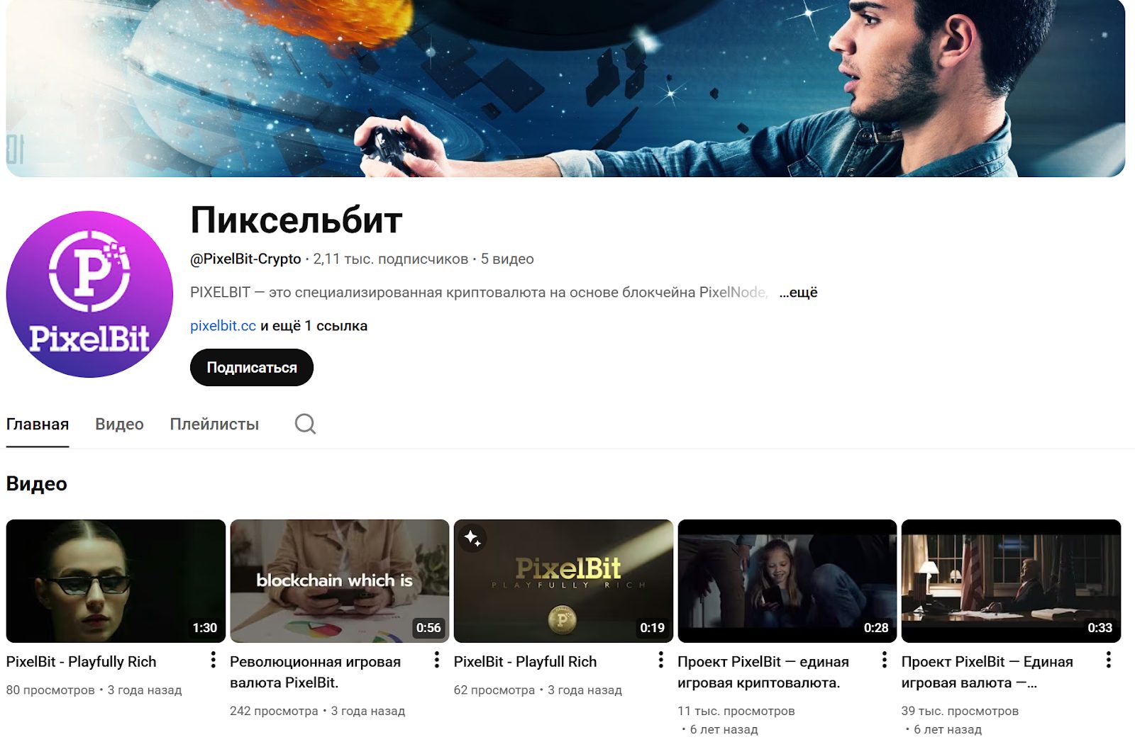 Для продвижения токена Pixelbit (PXB) клиентам было представлено ряд страниц в соцсетях. К примеру, проект в Ютубе доступен по ссылке PixelBit Crypto и привлек около 2,11 тыс. пользователей. При этом количество роликов крайне небольшое — всего пять. Последняя запись добавлена более трех лет назад, что говорит о заброшенности платформы.
