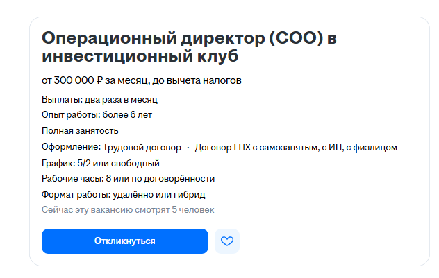 На данный момент он ищет только операционного директора на сайте hh ru, обещая зарплату 300 000 рублей в месяц.
