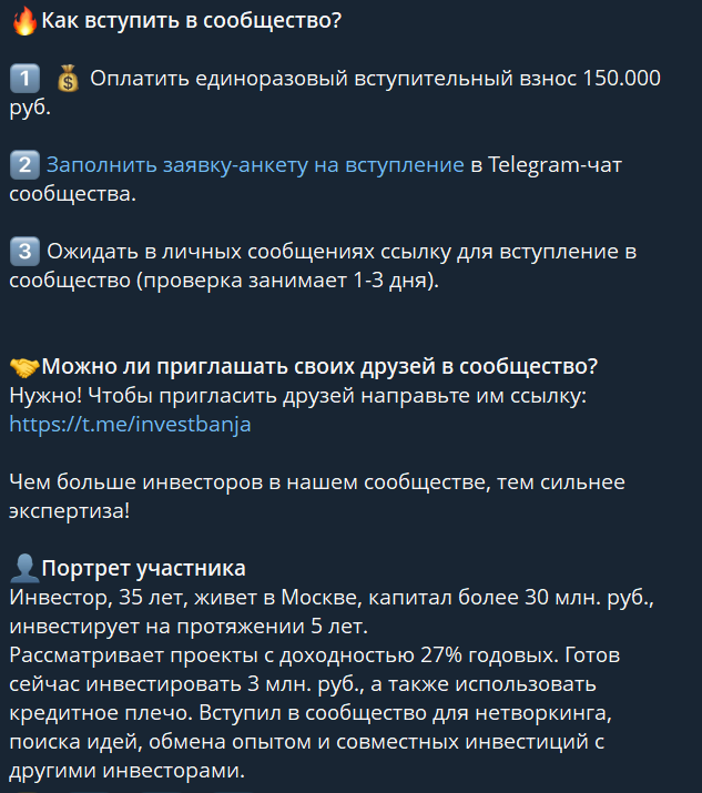 У клуба «Инвестбаня» есть отдельный телеграм-канал «ИнвестБаня. Инвестиции, пассивный доход, нетворкинг» (investbanja). Там всего 535 подписчиков, скорее всего, это резиденты. В одном из постов описано, как вступить в клуб.