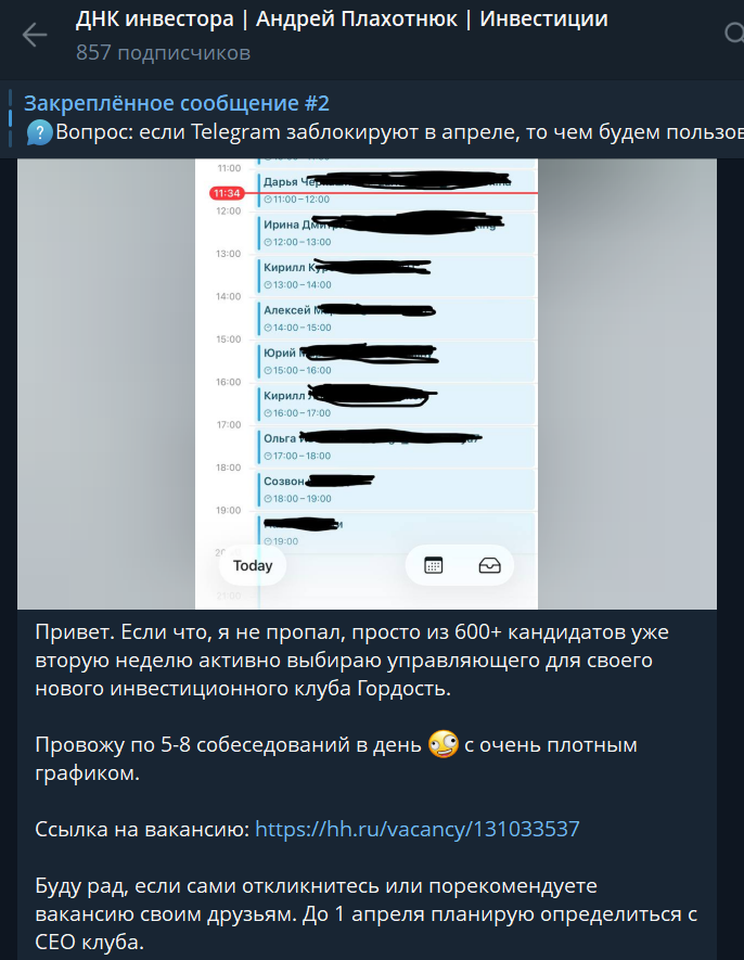 У эксперта есть телеграм-канала «ДНК инвестора | Андрей Плахотнюк | Инвестиции» (dnk investora) с аудиторией всего 857 человек. Видимо, автор не гонится за многочисленностью подписчиков. Группу ведет открыто, комментарии включены.