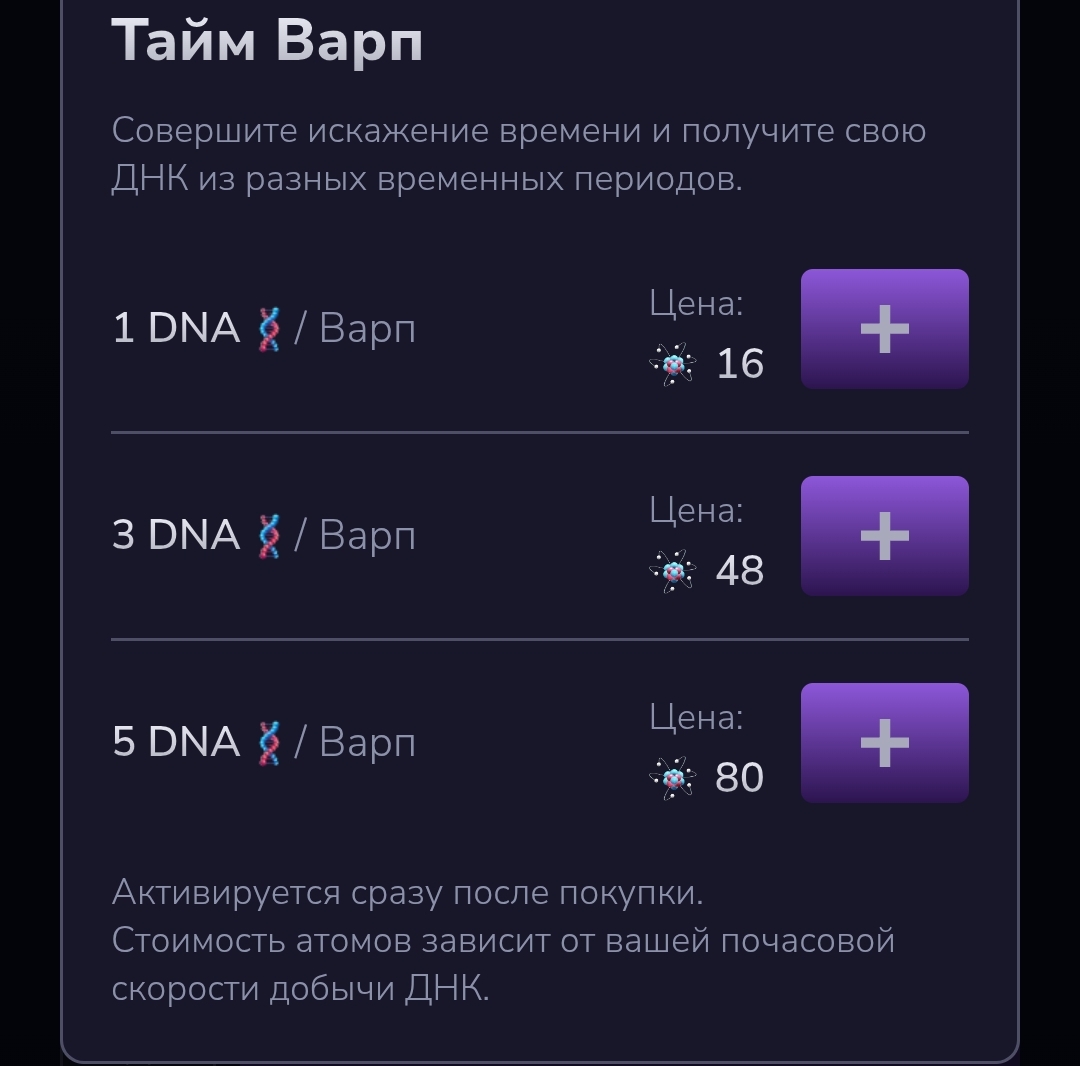 Другое усиление в игре — «Тайм Варп». С его помощью клиент может заставить систему совершить прыжок во времени и получить добытые за этот период «ДНК». К примеру, можно переместиться на 1 день и заплатить 16 «АТОМ», а перемещение на 3 и 5 дней обойдутся в 48 и 80 «АТОМ» соответственно.