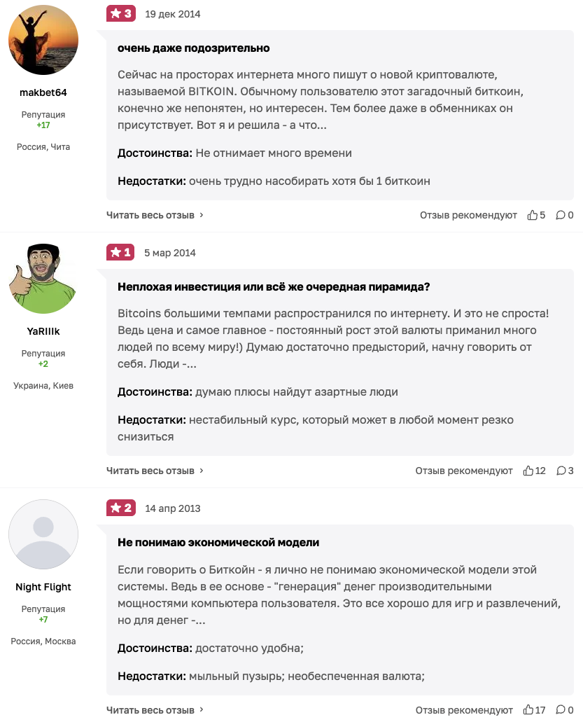 Негативные отзывы чаще всего исходят от тех, кто вложился в btc на хайпе, который впоследствии завершился резким падением стоимости монеты. Мнения таких людей в расчет брать не нужно, так как они сформированы на основе эмоций, а не фактов.