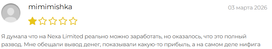 В сети есть различные отрицательные комментарии и отзывы о мошенничестве биржи Nexa limited com. Компанию называют опасной, поскольку аналитики обещают большие доходы, но ничего нельзя получить, когда дело доходит до вывода средств. Жалуются на блокировку счетов и говорится о том, что для того, чтобы снять её, с клиентов требуют за 72 часа внести $1,500.