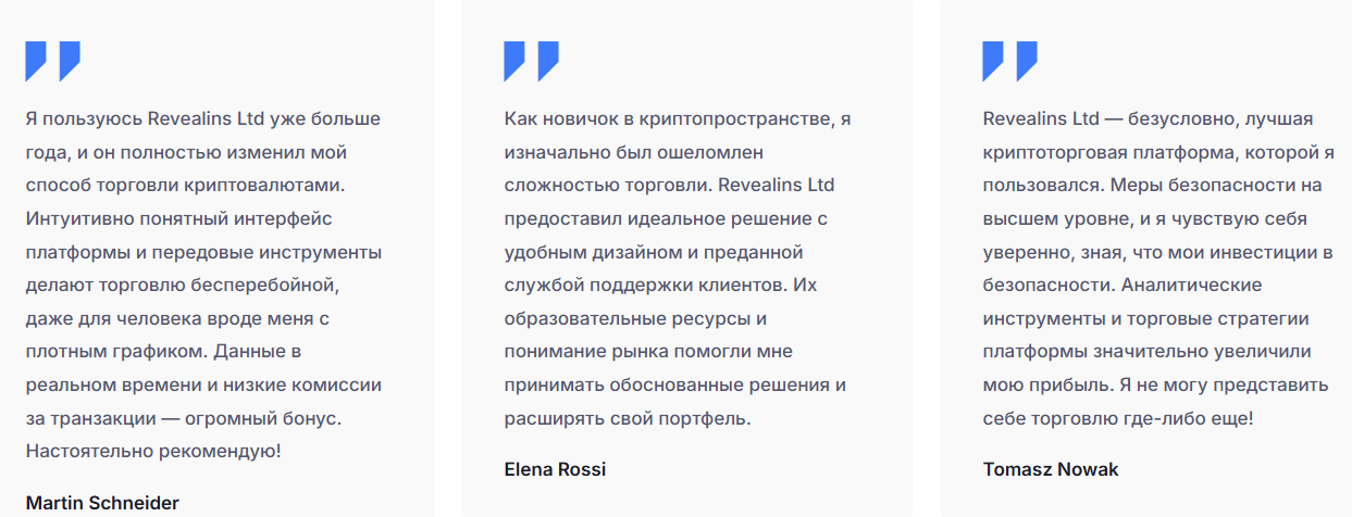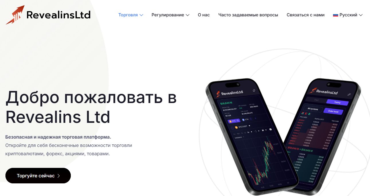 Revealinsltd создает образ универсального брокера с доступом к широкому спектру рынков. Команда заявляет о высоком уровне технологичности и безопасности. Однако при детальном анализе становится очевидно, что проект делает акцент на рекламе и визуальной презентации. А ключевые элементы, определяющие надежность брокерской компании, скрыты.